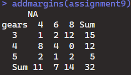 2.1 Add the addmargins() function to report on the sum totals of the rows and columns of assignment9 table