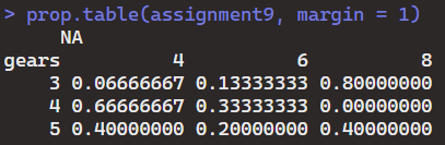 2.3 Add margin = 1 to the argument under prop.table() function, and report on the row proportions found in assignment9 table.