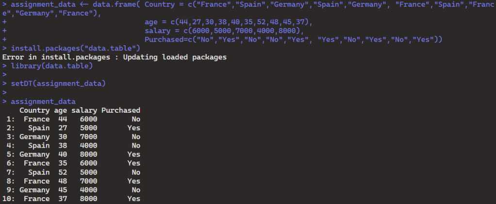 Here I took the data frame and turned it into a simple table using setDT() function.
