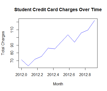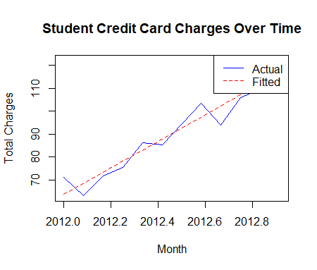 c) The time series plot provides a visual representation of how student credit card charges have changed over time. From the fitted plot, we can observe that the fitted line shows an exponential progression. Therefore, we can assume for future reference, that a student’s credit card charges will gradually increases as the months go by through each year.