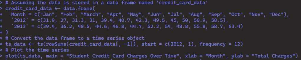 In this first step, once I created the data frame I had to convert it into a time series object so I could properly plot it as so.