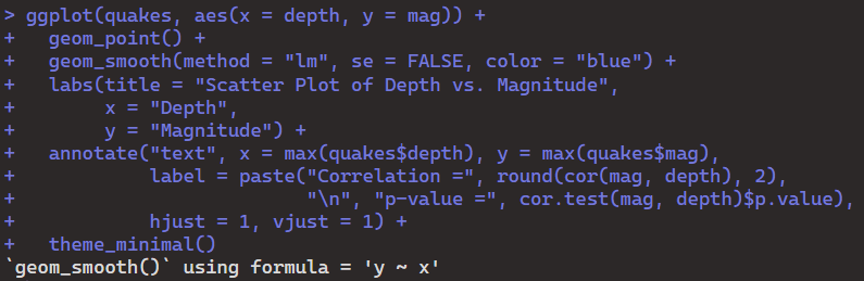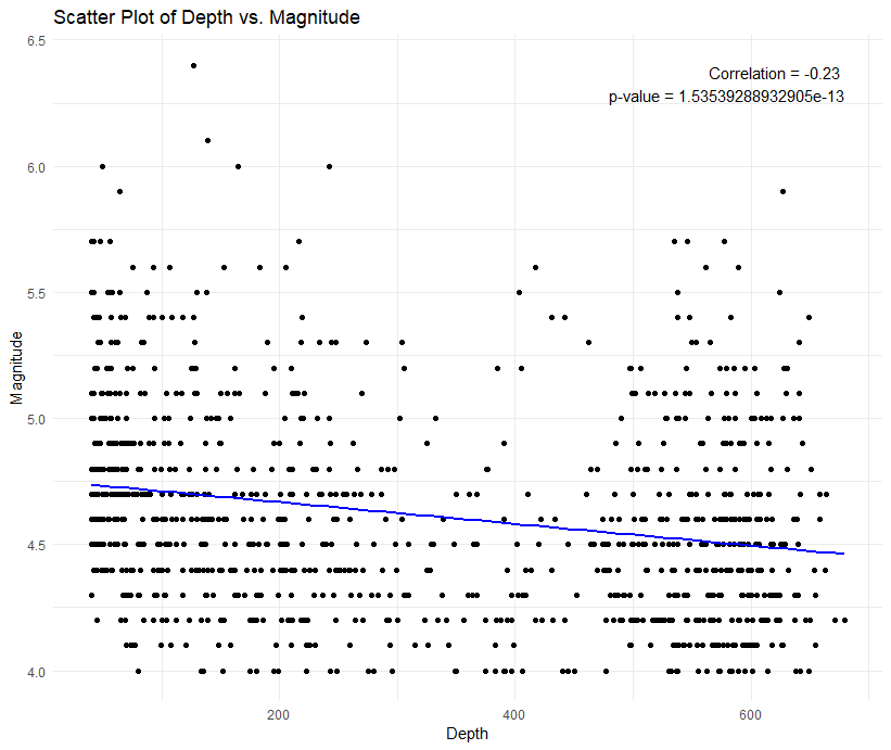 This study investigates the relationship between earthquake magnitude and depth using a dataset of seismic events. The analysis employs a Pearson correlation coefficient to assess the strength and direction of the linear relationship between these two continuous variables. The results indicate a significant negative correlation between earthquake magnitude and depth (r = -0.81, p-value < 2.2e-16), suggesting that as earthquake magnitude increases, depth tends to decrease, and vice versa. The extremely low p-value provides strong evidence against the null hypothesis of no correlation, leading to the rejection of the null hypothesis. The scatter plot with a regression line visually illustrates the observed relationship. The study contributes to a better understanding of the interplay between earthquake characteristics and informs seismic risk assessments.