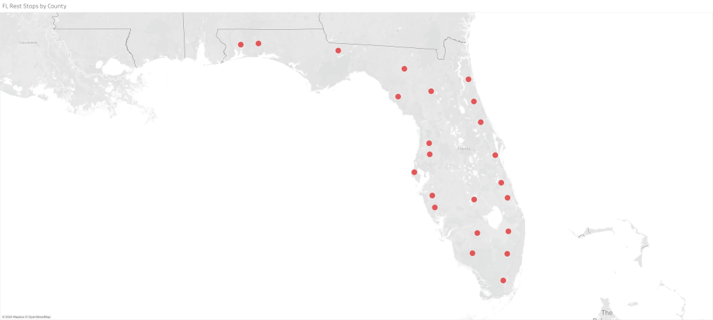 For this assignment I created a geographical map using a public dataset with rest stop addresses and tableau to showcase the location of counties in Florida that contain highway rest stops.