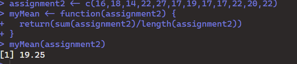 As you can see, the output of the function is correct. This function was successful because the structure of the function code was the correct syntax in R. The function had its name (myMean), a body(assignment2), and a set of arguments { return(sum(assignment2)/length(assignment2)) }.