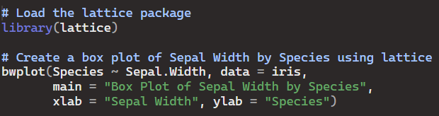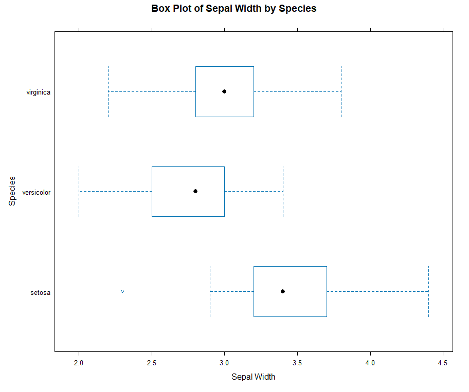 In this box and whiskers plot I used the “lattice” package in R to visualize more of a statistical summary of the same dataset. The mean, quartiles, minimums, and maximums of the sepal widths by species are easily recognizable in this plot.