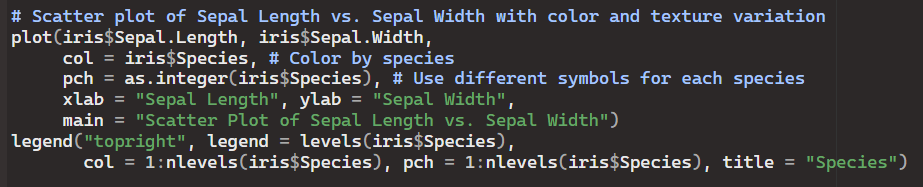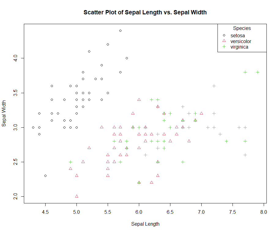 In this basic R visualization I chose to create a scatterplot that displays the “species” variables that are represented by both symbols and colors. This level of dimension creates contrast in the plot so the viewer can clearly see overlaps as well as recognize trends within the individual species.