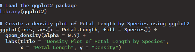 I personally prefer using the ggplot2 package in R for most of my visuals because of how much control it provides the user. I decided to represent the petal lengths in a density plot. out of all of the plots in this assignment I think this visual is most appealing to the eye/efficient for viewers. the ggplot2 package allows me to adjust the transparency(alpha) of the variables so overlap is clearly displayed. The large variance between species is also well displayed by the height differences of the density geometries.