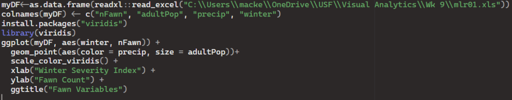 For the plot I used ggplot2 in Rstudio and used a dataset that provided various Fawn statistics.