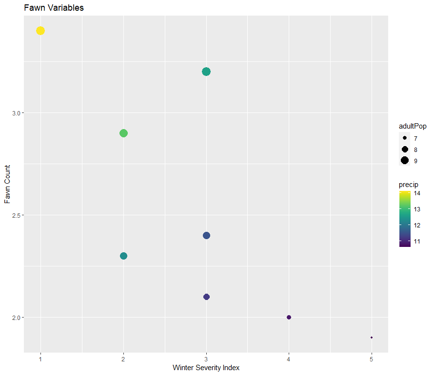 By applying these principles of design, the ggplot graph effectively communicates the relationships between the Winter Severity Index, Fawn Count, precipitation, and adult population size in the dataset.