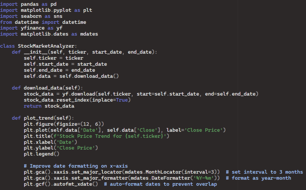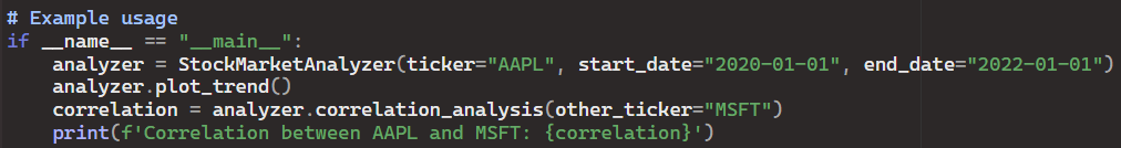 I created an instance of the StockMarketAnalyzer class, plot the stock price trend for Apple (AAPL), and calculated its correlation with Microsoft (MSFT).