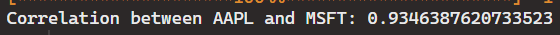 The correlation between the stock prices of Apple (AAPL) and Microsoft (MSFT) during the specified period is calculated. A high positive correlation indicates that the stock prices of these companies moved similarly during the pandemic.